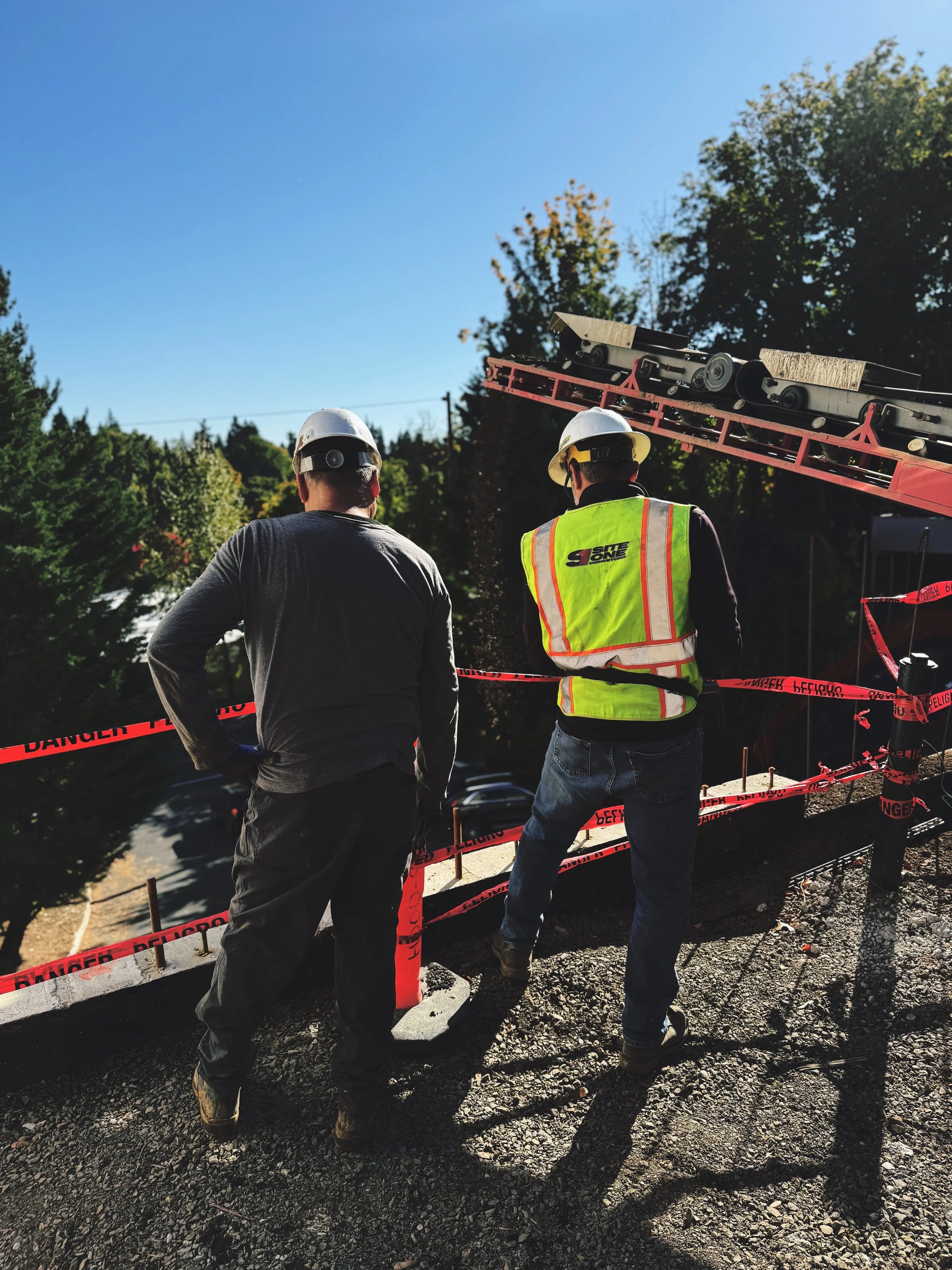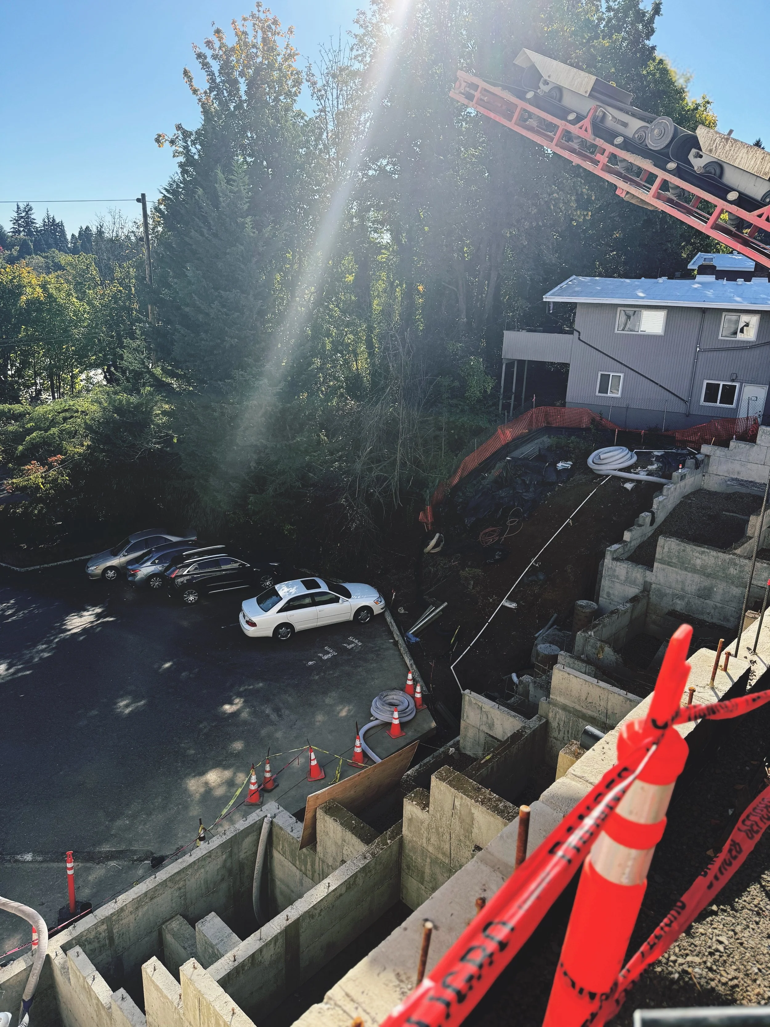Not every conveyor truck job is about distance or volume. Sometimes the challenge is angle, accuracy, and what’s surrounding the target. On a recent townhome foundation fill in NW Portland, S1 operator Matt had to throw drain rock downhill into a foundation with buildings on both sides and a parking lot full of cars below. There was no margin for a miss — and no other practical way to get the material where it needed to go.