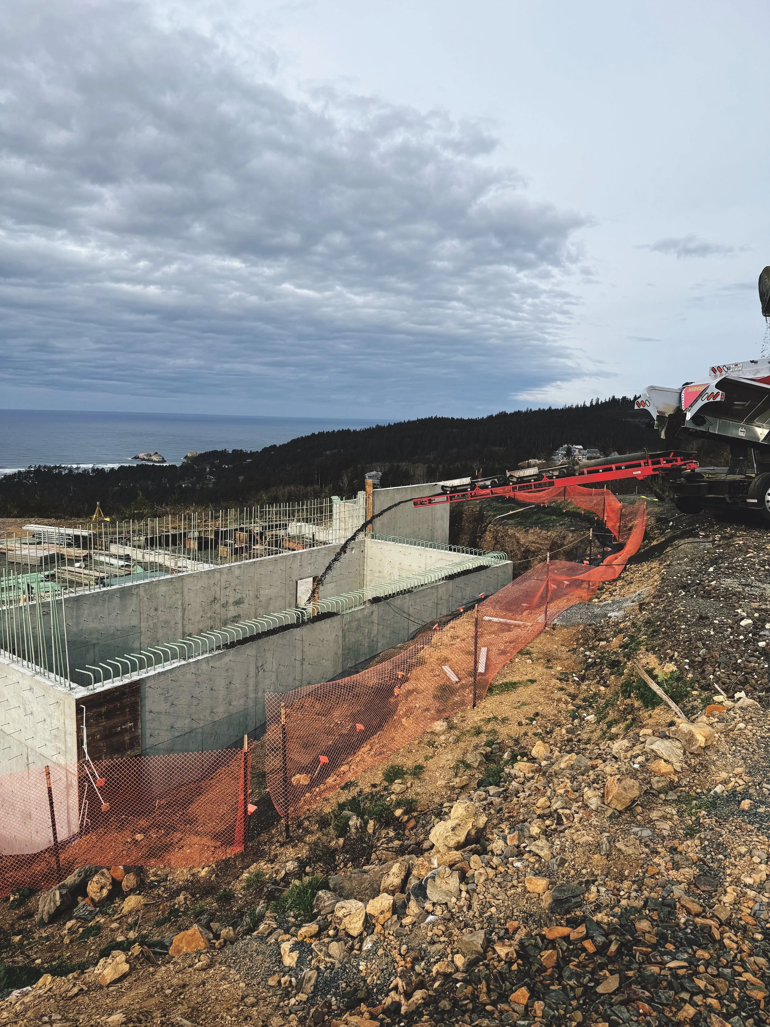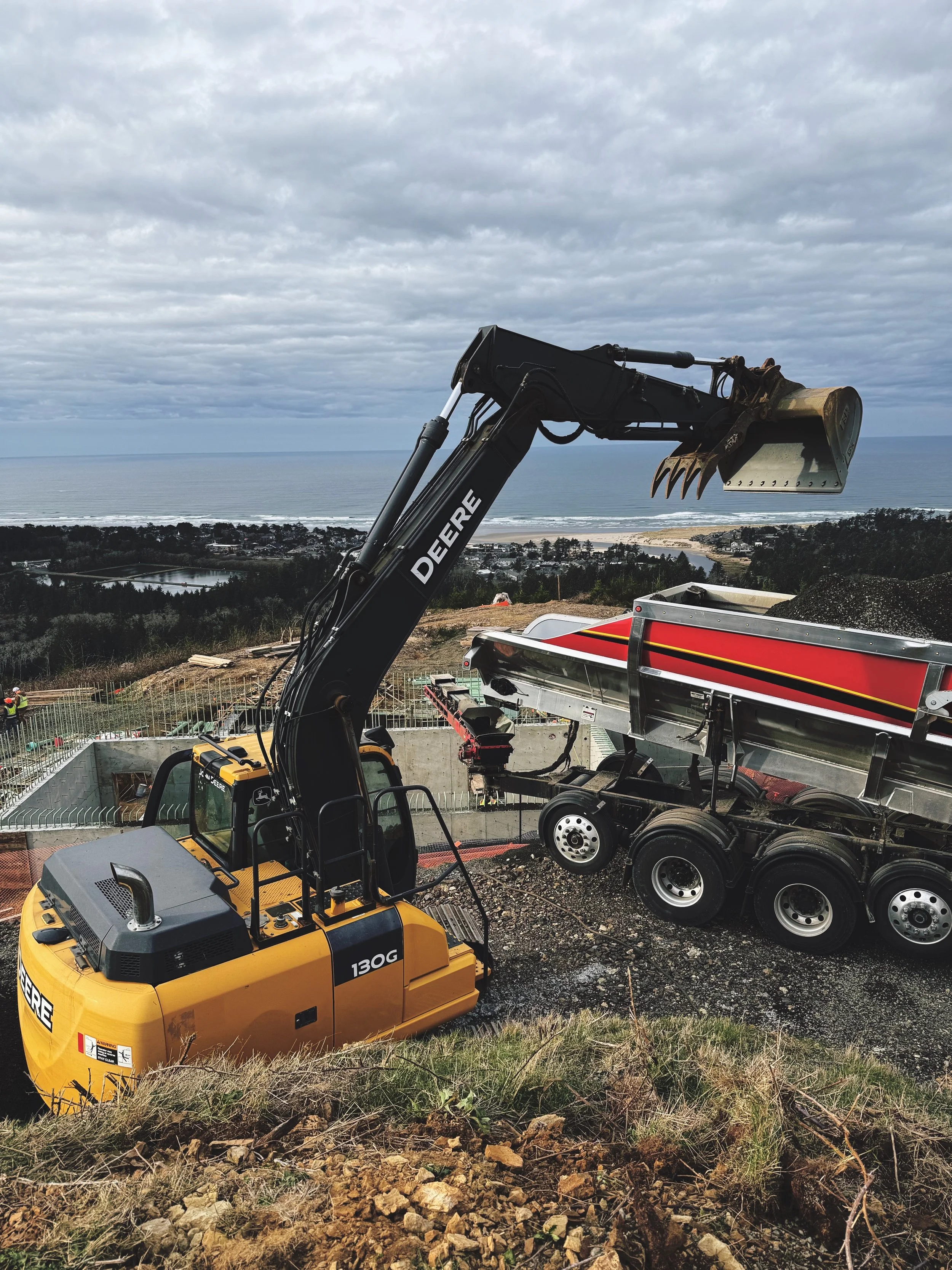 This custom home is being built high in the hills above Cannon Beach, with a direct view of Haystack Rock and the Pacific. The foundation is cut into a steep hillside, and with a slab pour coming up, the base material needed to be placed right — ¾” minus crushed rock, compacted in lifts, no shortcuts.