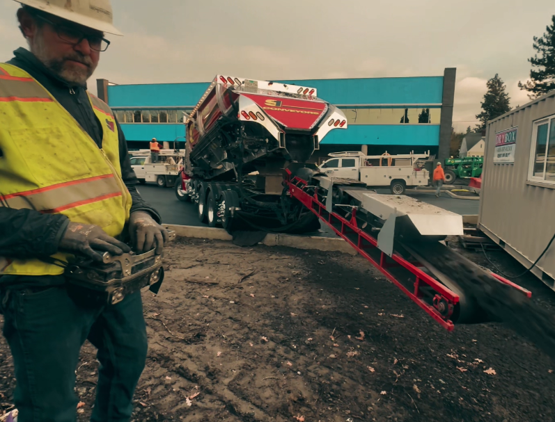 The parking lot was bustling — boom lifts running, multiple trades working — when the landscape contractor needed 202.5 yards of 3-way blend placed into the planting areas around a newly built commercial building in NE Portland. S1 dispatcher Jenna had the logistics sequenced before the first truck left: material sourced from S1's material blend yard, truck arrivals staggered 30 minutes apart.